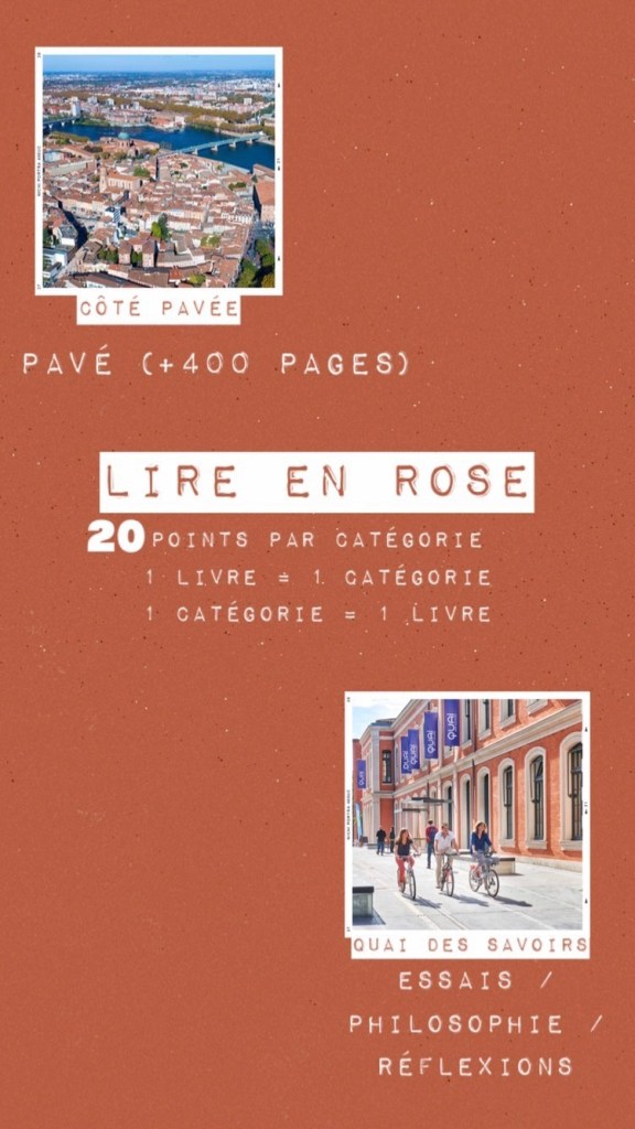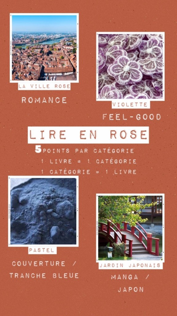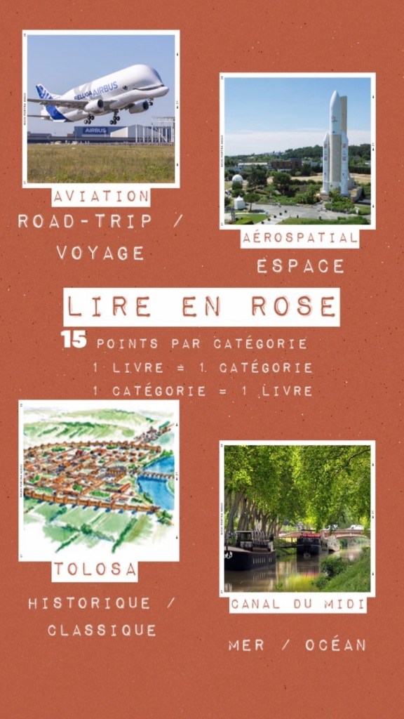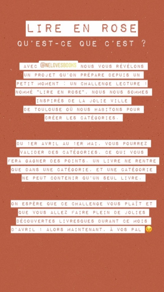 C’est officiel, je participe au Challenge « Lire en Rose » organisé par Nathan et Nelly (@lesinfoslivres @nelovesbooks ) ! Ce challenge, inspiré par la ville de Toulouse devait débuter début avril, mais comme tout le monde semble redouter l’ennui des prochaines semaines, le challenge à été déplacé et commence dès demain (16 Mars) et se terminera le 1er Mai prochain !