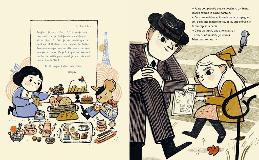 « Kafka et la poupée » est album d’une grande simplicité en apparence. Cependant, il implique une double narration par l’insertion des lettres de Soupsy au sein de l’histoire. Ce double récit est habillement transcrit graphiquement, permettant à l’histoire d’acquérir un rythme unique et riche !